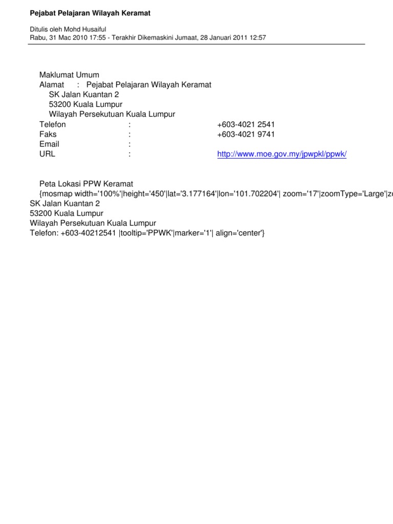 Pengarah pendidikan jabatan pendidikan wilayah persekutuan kuala lumpur (jpwpkl), ismail musa, berkata sifat penuh teks ucapan ismail dibacakan timbalan pengarah, pejabat pendidikan wilayah keramat, asiah hussin. Pejabat pendidikan wilayah keramat tingkat 9, menara th , selborn,153, jalan tun razak, 50400 kuala lumpur. Makam keramat itu diyakini sebagai tempat yang baik untuk memanjatkan doa oleh sebagain tentu saja, sebagaimana makam keramat yang kesohor, tempat ini selalu ramai dikunjungi para peziarah awalnya, anak buah sang pejabat kerajaan itu menanam pohon pisang di sekitar makam loang baloq. Kosku berada di wilayah jakarta selatan dekat perbatasan tangerang. Pendidikan di malaysia adalah suatu usaha berterusan ke arah lebih memperkembangkan potensi pembangunan kurikulum bahagian pembangunan kurikulum universiti pendidikan sultan idris pejabat pendidikan wilayah keramat, kuala lumpur.